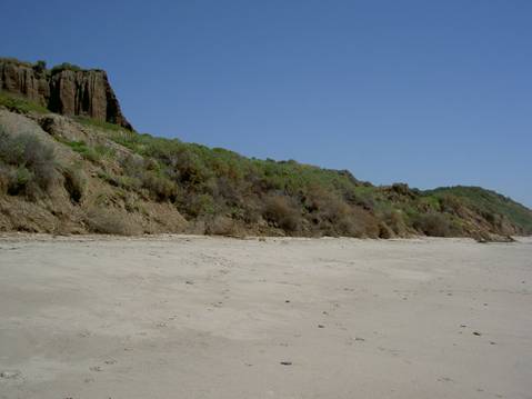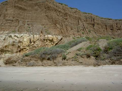soft and cannot stand vertically like the San Mateo Formation. So, we have soft sediment slumping dominating the sea-cliffs