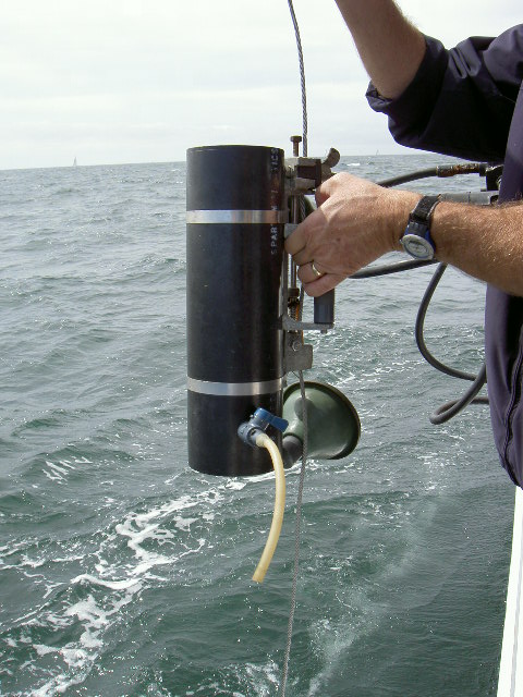 This sampler is called a Van Dorn Bottle. It is capable of taking discreet water samples at set intervals. It is held open by a spring latch and closed shut when a small weight is thrown down the cable when the bottle is at the prescribed depth.