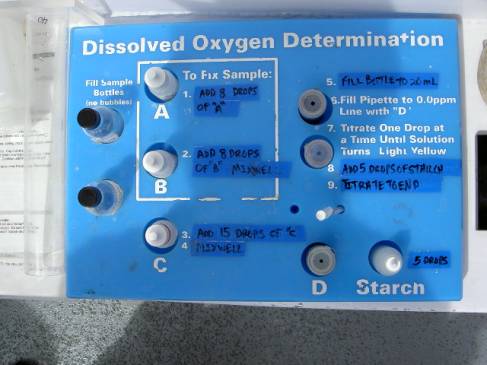 Dissolved oxygen is measured onboard using the Winkler Titration Method. This is the same method we use in the classroom during the Seawater Chemistry Lab. The maximum dissolved oxygen contained in seawater has many different variables.